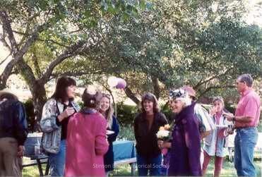 Group photo of people in the park w/Peggy who holds a bouquet of flowers. Smiling in her purple cape and jeweled crown, she looks at a woman (Marion Weber seen from the rear) speaking. Listening are (L to R) Elizabeth Sapanai, Cindy Adler and another unidentified woman with shoulder-length brown hair. Apart from this group, on the right is Elmer Collett and an unidentified female with her hand in front of her face.Collection