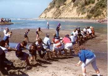 This color photograph shows a line of men pulling on a rope. The line stretches from the lower left hand corner of the picture to the mid right side of the picture. Beyond the men is the entrance channel to the lagoon and beyond that the Bolinas beach and part of the bluff.