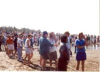 This color photograph shows the men lining up for the men's tug of war. The line of men extends from the left middle ground of the photo to the right foreground. The men are looking towards the right of the picture towards Bolinas. The man at the far right in blue shorts and tee shirt is Bob Rippe. Across the rope from him and closest to the camera, in brown pants and purple tee shirt with dark hair is Tyrone Jamito. Behind Tyrone, on his side of the rope in brown shorts, blue shirt and blue baseball hat is Scott Tye. A large crowd is gathered behind the participants.Collection
