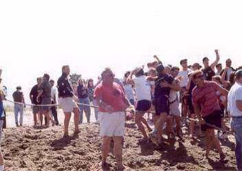 Color photo shows Dennis Murphy in red t-shirt and white shorts standing in the foreground holding onto the tug of war line. A crowd of jubilant men stand on the far side of the line, some with arms raised , some hugging, and several other men are spaced along the rope holding it up.Collection