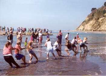 Color photo of a line of women tugging on the rope across the Bolinas Channel, up to their ankles in water. They are being observed by a group of people on the sand in the background. and a few in the water on the far side of the rope (notably Bob Checcini). The women are all seen from behind and not identifiable.Collection