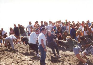 This color photograph shows the anchor end of the women's tug of war. The line of women are in the dry sand pulling towards the left of the picture. A man in blue jeans, a white short sleeved shirt and baseball cap is standing at center foreground in front of the women and behind the women is a crowd of bystanders most of whom are looking to the right towards the women at the front of the line and the Bolinas side shore.Collection