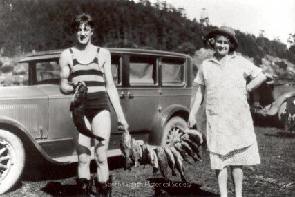 This black and white photo shows a young man (Robinson [Bob] Upton) and a woman (Annie Robinson [Upton]), his mother, holding a string of fish between them. The young man is on the left. He is wearing a bathing suit with a striped tank top and solid lower part, and boots on his feet. He is holding a large fish in his right hand and one end of the string of 11 or 12 smaller fish in his left hand. The woman, is holding the other end of the string. She is wearing a skirt under a short sleeved smock and a brimmed hat and has one hand on her hip. Both are smiling at the camera. Behind them is a 20's vintage car.Collection