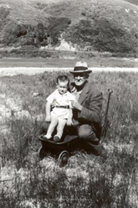 Black & white photo (from a slide) of Judge Archibald Upton holding baby boy Charles R. Upton on his lap. Both are seated in a small wagon parked in the dune grass in Stinson Beach, possibly along the Seadrift Lagoon. The hillside is visible in the background. The Judge is in a suit and wearing a hat with dark headband. The child is in white shirt and shorts and white shoes.Collection