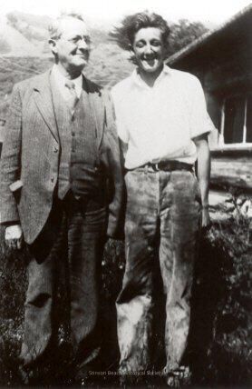 Black & white photo of Judge Archibald Upton standing shoulder to shoulder with Robinson Upton, whose hair is blowing wildly in the breeze. Judge is dressed in a sober pin-striped suit, vest, white shirt & tie, glasses perched on his nose. Robinson is casually dressed in short sleeved open necked white shirt and belted work pants. He smiling but his eyes are closed. The are standing in front of the log cabin, wood beams and window barely visible behind them on the right, hillside in the left background.Collection