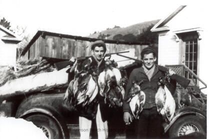 This black and white photograph shows two young men standing in front of an automobile with numerous ducks tied at the neck and slung around their shoulders. The young man on the left has about twice as many ducks as the man on the right. Both are looking straight at the camera. There are some buildings behind the men and the car.Collection