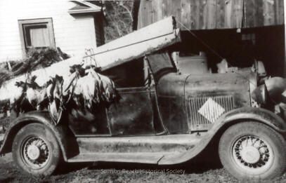 This black and white photograph is of an open Model T automobile. It is a side view and the vehicle is parked in front of some buildings. There is what appears to be a long roll of carpeting on top of the car slanting from on top of the windshield back to the back of the car and protruding farther than the back of the car. Bundles of dead ducks, tied at the neck, are hanging from the cylinder onto the side of the car.Collection