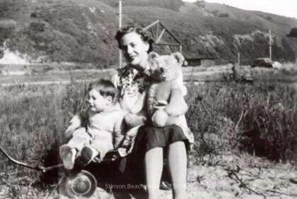 Black and white photograph of Marian Upton sitting with her son, Charles, in the dune grasses of Stinson Beach. She is holding a large teddy bear on her lap. He son is sitting by her side looking away from her and Teddy. He's wearing a light colored jumper; she wears a dark shirt and light sweater. Behind them is the Robinson house under construction. Only the frame is visible. The hillside slopes up in the background.Collection