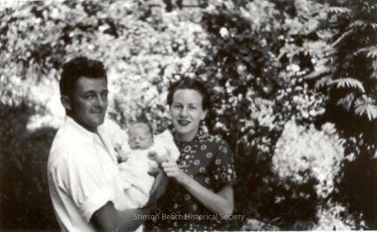 Black and white photograph shows Robinson Wallace and Marian Upton showing off their sleeping newborn, Charles. The couple is standing in front of foliage. Robinson is cradling his son, who is wrapped in a white blanket, in his arms. Marian, in a dark print dress has her hand on her son's arm.Collection