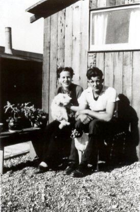 This black and white photograph shows a young couple, Marian and R.W. (Robinson) Upton, sitting side by side on a bench against the side of a house. The woman is on the left and holds a white dog in her lap. The man is on the right and there is a dog standing in front of him between his feet. The house (see notes) has wood plank siding and there is a curtained window above the couple's heads. To their right is a bench holding some potted plants and part of a neiboring house can be seen beyond. Both are smiling at the camera.Collection