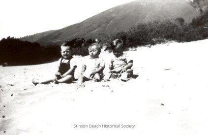 This black and white photograph show three babies sitting in a row on a sand dune. Thereis some shrubbery behind them and a mountain rises in the background. The baby on the left is a boy. It is hard to determine the sex of the other two. One of the babies is Charles Upton and the other two are his cousins.Collection