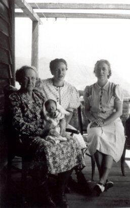 This black and white photograph shows three women seated on a porch. The woman on the left, closest to the camera is wearing a floral print dress and is holding a tiny baby. She appears to be the oldest of the group. The women next to her are wearing light, short sleeved dresses. All are looking at the camera. The women are from left to right: Etta Altha Scott Smith, Marian Ingols Davis Upton and Etta Smith Davis. The baby is Charles Robinson Upton. See notes.Collection