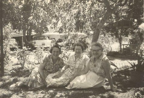 Photograph of 3 middle-aged Avera Sisters taken under shady trees in front of a house with attached garage. Two cars are parked in front. Three ladies sitting and smiling are, Louise Airey and her sisters Evis Gofinch and Ruth Riddle from the left. They are all wearing cotton dresses. A garden chair can be seen under the shade to right. On the back of photo is written in pen: Louise, Evis and Ruth-July 1957-Nice, California.Collection