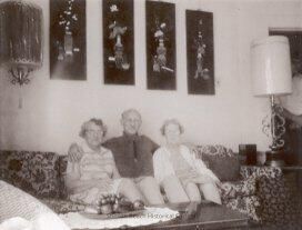 A black and white Polaroid photo of 2 ladies and 1 man sitting on a couch inside of a living room. The man who sits in the middle must be Louise Airey's brother, the lady on left is Louise and on right must be her sister, Ruth. The room is decorated somewhat Oriental with a Chinese lantern hanging to left and 4 Chinese lacquered decorative panels on the wall. Chairs are covered by middle eastern motif cloth. The table in front has a tray of wooden fruits on its crocheted trivet. There is a brass table lamp on the right of the photo.