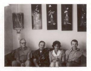 A black and white Polaroid photo taken probably at the same day as 1004-119-03. Four people sit on the same couch. On the back of photo, it is handwritten in pen, 1973, Bob Riddle , Robert Airey (Louise's adopted son), Ann Mcatee. James Avera. Children of Ruth Riddle, Louise Airey, Evis Gofinch, F. L. Avera.Collection