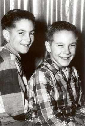 Semi-formal portrait of two smiling young boys, Charles Robinson Upton (L) and Gary Waldo Upton (R). Both are wearing plaid shirts and have slicked back hair. They are sitting in front of a curtain, sort of at an angle, with Gary more or less facing right, and Charles seated so he is looking over his shoulder at the camera.Collection