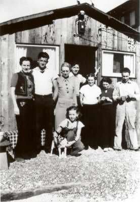 Family photo taken after the wedding of Marian Davis & R.W. Upton in front of a small wooden house built by R. W. Upton in 1935. The standing group consists of (L to R): Marian, R.W., Etta, Ed Davis, Carmen Davis, plus an unidentified woman in dark clothing with her head down and hands together, and an unidentified male wearing a light shirt and slacks in the same position. Kneeling in front of Etta is a young child, Weston Davis, wearing a overalls and white short-sleeved shirt. She is holding onto Doris Davis's small dog, Punch. Ed Davis stands behind Etta in the doorway of the cottage. A small pair of curtained windows flank the door.Collection