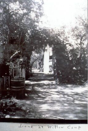 This black and white photograph shows a road leading away from the camera under an ivied arch. There is part of a building visible beyond the arch. There is a fence at the left of the picture and a planted barrel beside the fence. The road is shade dappled and the area is woodsy. At the bottom of the photo is hand-written 'Lane at Willow Camp'.Collection