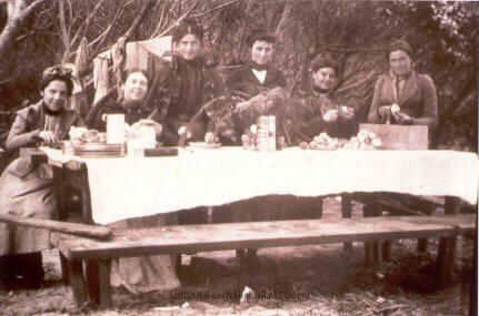 This black and white photograph has faded to a sepia color. It shows five ladies in late 19th century garb and a man, seated or standing behind a long picnic table covered with dishes and food. The four seated ladies are all working on something with their hands. One woman and the man are standing at the center. The woman is cutting something on a plate. There is a white cloth on the table and some cloths hanging on the branches of one of the treew behind them.Collection