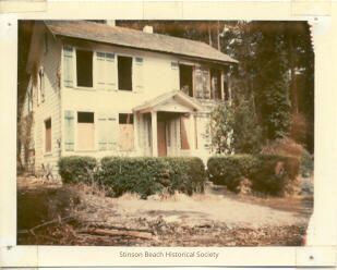 A color photographic print of Easkoot house after the fire. Some repair work could be seen around the upper floor window frames. The lower floor windows were boarded with plywood. This photograph and 2004-122-02 are the parts of the flyer posted at the real state office in 1977. The flyer, 2003A-122, reads: Victorian in heart of Stinson Beach. Partial Fire - House Needs Restoration. Located on 3.5 Acres. $250,000.00 Possibility of additional building.Collection