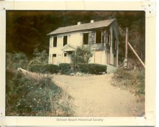 A color photograph of partially burned Easkoot house taken for the purpose of the real state sale. Partially repaired and boarded house is seen with the temporally electrical pole standing next to it. The dirt driveway leads to the house in the mid ground. See , also,2004-122-01 and 2004A-122.Collection