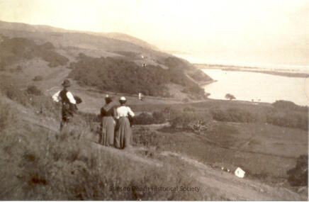 This black and white photographic print has faded to a brownish purplish and white. It shows three people standing on a hillside with their backs to the camera. They are, left to right a man wearing a hat, a white shirt and dark vest and holding a jacket on one arm, and two ladies wearing hats and long skirts, one in a dark blouse and a shawl, the other in a white blouse. All are looking out over a body of water (the Bolinas Lagoon). There is a sand spit bordering the far side of the lagoon with the ocean on the other side. White Gate Ranch in the distance, Stinson Ranch below.Collection