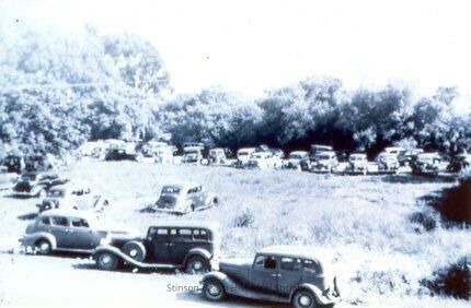 This black and white photograph has turned to blue and white with age. It depicts a circle of cars parked around a grassy plot. One car is parked on the grass itself. They are all old cars possible dating from the early 1900's. See Notes.Collection
