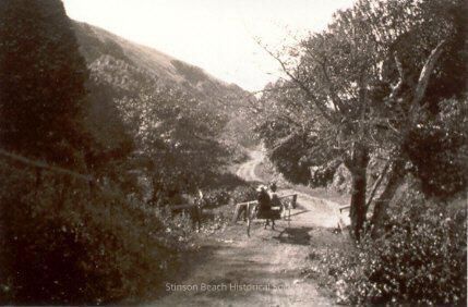 This black and white photograph shows a road leading away from the camera crossing a bridge and continuing on up a hill. There is a two wheeled buggy driven by a woman wearing a wide brimmed hat moving away from the camera and just starting onto the bridge. There are trees and shrubs on both sides of the road. See notes.Collection