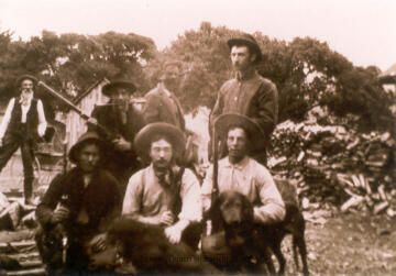 This black and white photograph has faded with age to sepia. This picture is of seven men. Three are crouching in a row in front with three standing behind them and the seventh man is standing in the background on the left. The three men in front are wearing wide brim hats and are holding guns over their shoulders. The man on the right and the man in the center are holding dogs with their other hands. The dog in the center is blurred/moving. The left hand man in the back row has on a wide brim hat and is holding a gun. The man next to him is wearing a jacket (the other men are in shirt sleeves) and has no hat. The man next to him on the right is wearing a narrow brim hat. The man on the far left behind the group is wearing a brimmed hat and a white shirt with a dark vest. He has a long white beard. A barn is partially visible behind all the men as well as some trees and shrubbery.Collection