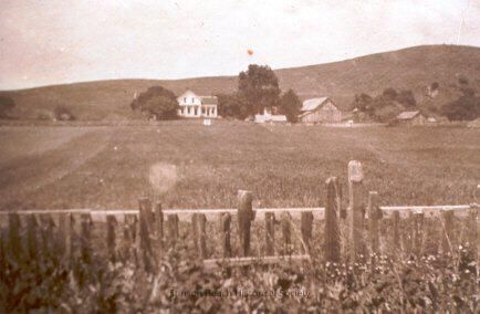 Long view of white ranch house, wooden barn and smaller outbuildings. Photo taken from behind a wood fence holding back field grasses. Across a long meadow and at the base of a sloping hillside sits Las Baulines Ranch. The 2-story house has large trees on either side. The trees on the right separate the house from the barn. Between them is a long low building and to the right of the barn is a smaller stable-like structure.Collection