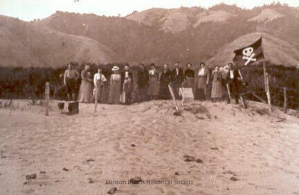 The scene shows a group of 14 men and women standing in a row and facing the camera. Behind them are tree covered mountains and before them a large expanse of sand. At the right of the picture and just in front of the people is a flag pole stuck in the sand, showing a white skull and crossbones on a black background. The clothing appears to be from the early 1900's.Collection