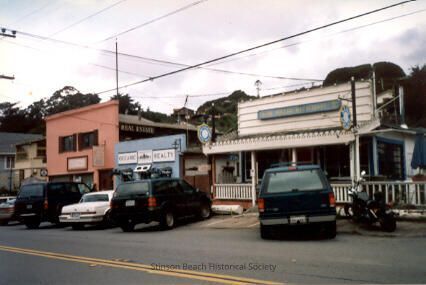 An original color photograph of downtown Stinson showing, from right to left: Sand Dollar Restaurant, Oceanic Realty, Stinson Beach Library, Al's Alledged Antique Store, and The Shore Store. Five cars, including 3 station wagons, are parked in front of the businesses. The yellow double lines of the highway is shown in front.Collection