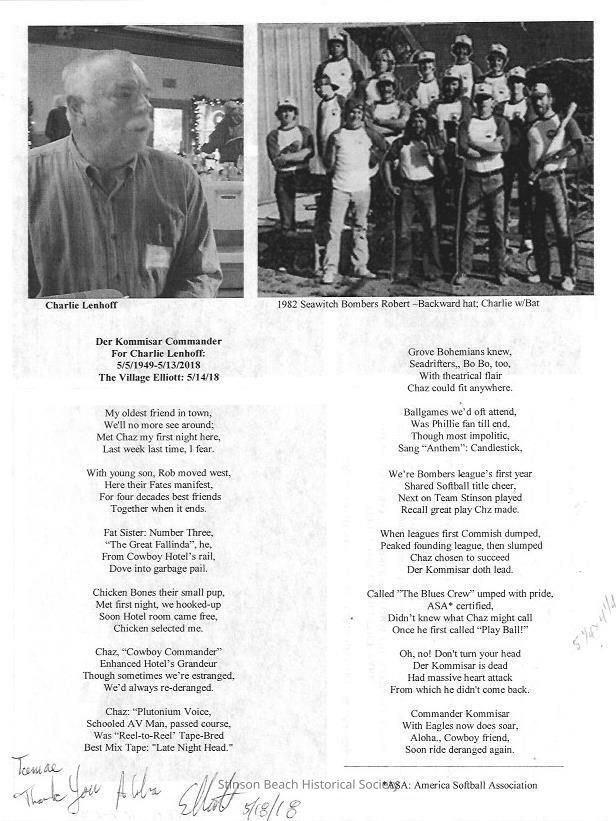 Printout of side one of an homage to Charlie Lenhoff by Elliott Kolker.Collection
