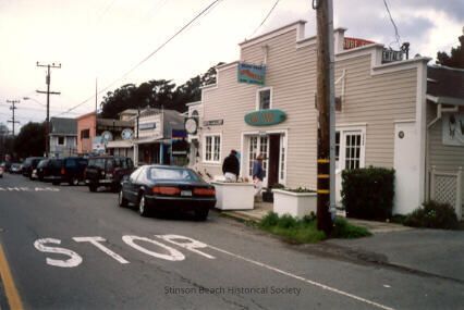 An original color photograph of Stinson Downtown in 1996 showing from the right, Avilla's Barn housing three businesses (see 2005-100-01), Sand Dollar Restaurant owned by Kendrick Rand, Stinson Beach Library, Al's Alleged Antique Shop owned by Al Engel (only the second story yellow dormer visible), and the Shore Store owned by Mame Grace (her partner Julie Spencer was deceased by then). Several cars are parked in front of the businesses. "Stop" written on the highway indicating approaching stop sign is seen on the road in front of them.Collection