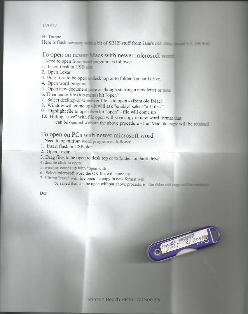 This is a UBS Flash Drive with a copy of everything on Jane Slack's old computer regarding SBHS. Don Slack who made this included an instruction sheet which tells how to open it in a newer Mac and or PC.Collection