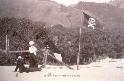 Two people (man & woman) on the sand in front of some wire fencing, foliage behind and hills beyond. He is sitting on the sand, leaning back on his hands with legs outstretched. He is wearing a black suit and a white ranger-type hat. She appears to be leaning on a wooden beam that holds the wire fencing. Wears a black shirt, white blouse and hat. They are looking towards a black flag with a skull and crossbones on it that is attached to a wooden staff holding up the fencing.Collection