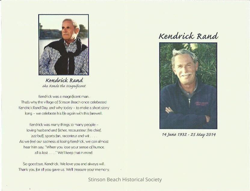 Program that was passed out at Kendrick Rand's Memorial at the SB Community Center in June 2014. It shows photos of him on both the front and back (original is folded in half). The back also includes a short eulogy to "Kendo the Magnificent."