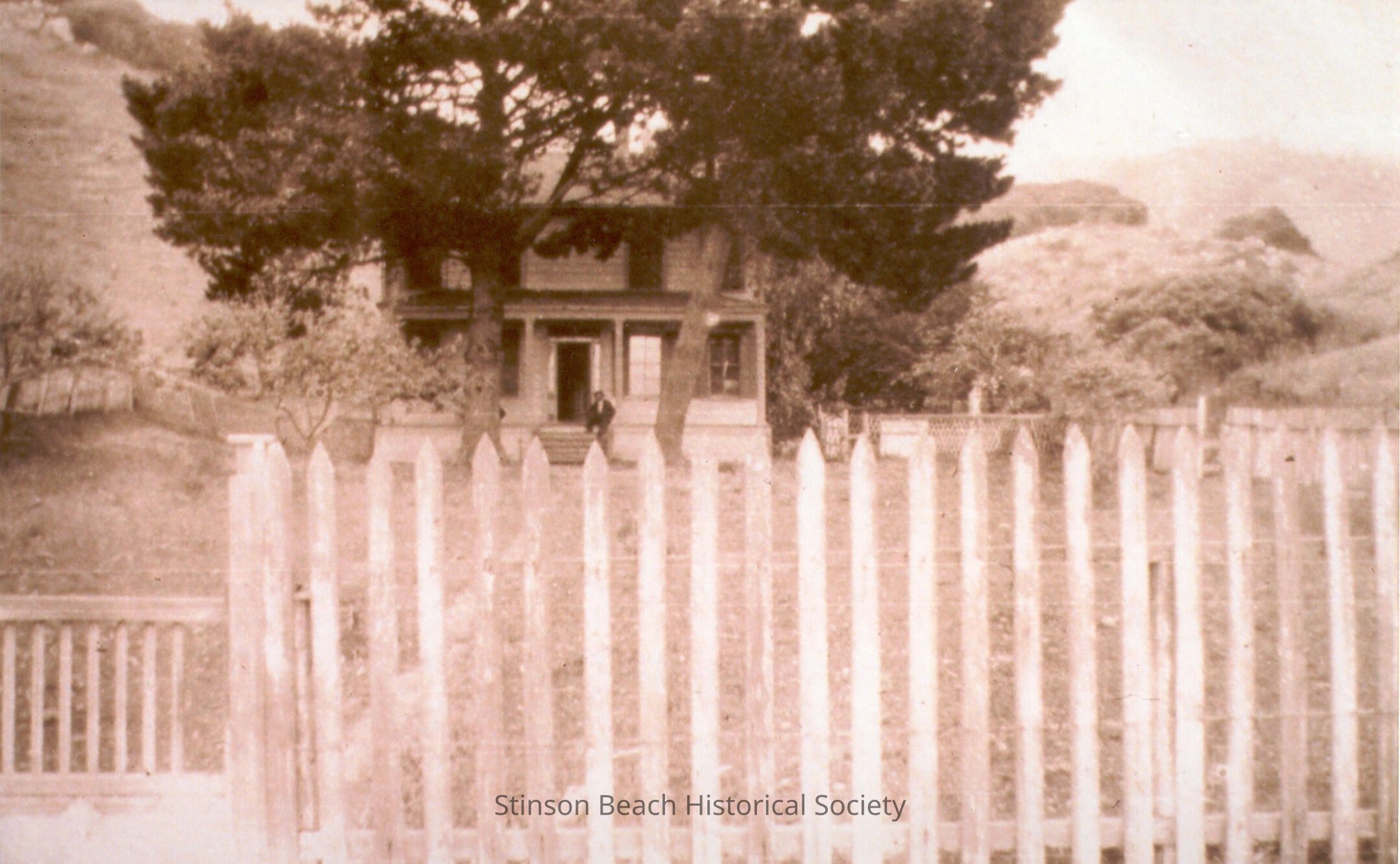 This black and white photograph has turned pinkish with age. It depicts a white picket fence in the foreground with a house beneath a large shade tree behind. There is a man standing besice the frint stips of the house. There are hills in the background.Collection