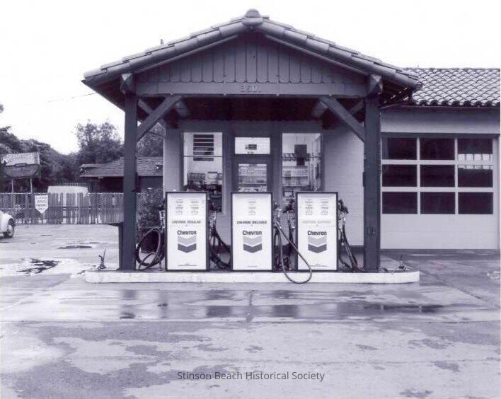 A black and white photograph printed from scanned image. The photograph of the Chevoron gas station was taken by Bill Sullivan, the son of Nancy Sullivan, in 1977 while he was studying photography at UC Sant Cruz. The Chevron gas station stood at the corner of Calle Del Mar and Highway One, across from the Superette Store, 3501 Shoreline Highway. The photo shows the station with Spanish tile roof on wood frame in front and stuccoed office and repair shop of the main building in the back. There are 3 gasoline pumps in front - Chevron Regular, Chevron Unleaded, and Chevron Supreme. It was owned by Gene Abbot at the time. It was purchased by Proctor Jones' Dipsea Property in 1980's and eventually by KMC Corp in the 1990's who demolished it during the tank remodeling. Due to unforeseen circumstances, politically and otherwise, it was decided not to pursue the reconstruction. It was the last gasoline station in Stinson Beach. It is written on the lower right margin in pencil, Original Photo by Bill Sullivan '77.Collection