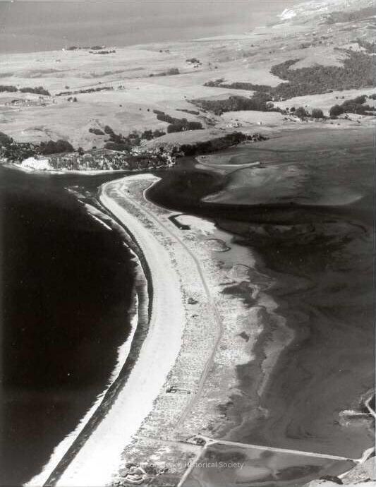 Overview of Bolinas Lagoon and Seadrift Sandspit. There is a road down the middle of the sandspit and 2 or 3 structures visible from the air. On the far side is the broad and basically barren Bolinas Mesa, although trees and some structures are visible closer to the shoreline. In the distance on the cliff edge can be seen the old RCA transmitting station.Collection