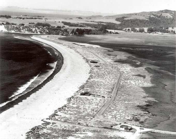 Overview of Seadrift Sandspit where the first houses are visible. We see the sandy beach on the left of the spit and the shallow lagoon on the right. The sandspit is sparsely vegetated and has a dirt road traversing the middle. There is one house at the beginning turn of the road, a second on the left side down a short way, and a third, also on the left side of the road further down. The contours of Bolinas are visible on the far side.Collection
