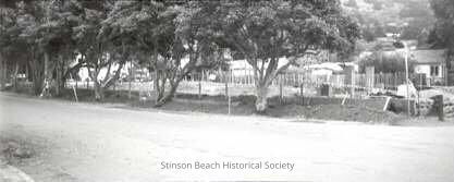 Corner site of Village Green and beginning of construction. There are trees lining the site where mounds of dirt are visible, fenced off from the building beyond.Collection