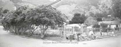 At the corner of Arenal and Calle del Mar, the corner lot is roped off and a pile of rock sits at the corner, as well as a black lab. There is one person with a shovel near a sand pile. Trees line the Calle del Mar side of the (future) park on the left of photo. Rooftops of adjacent buildings are visible behind the wooden fence at the park boundary on the far side.Collection