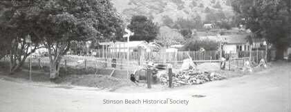 At the corner of Arenal and Calle del Mar, the corner lot is roped off and a pile of rock sits at the corner, as well as a black lab. Trees shade the Calle del Mar side of the (future) park on the left of photo. Rooftops of adjacent buildings are visible behind the wooden fence at the park boundary.Collection