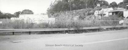 Street view of Village Green II property, which is overgrown with weeds held back by a chainlink fence. There is a metal retaining railing in front of that curbside. On the far side can be seen the rear of the Library. To the right are the two houses (Airey's & the white one next door) that front Highway One.Collection