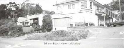 Wide angle shot of NE corner of Calle del Mar at Highway One. The 2-story building sitting uphill is Becker's by the Beach. Benches sit on either side against the building. There is an open upstairs porch above the entranceway. A pick up truck is parked in front of the entrance to the store. Stonework lines the culvert between the store along the road. Also grasses grow along the highway. Beyond the store on the highway are two residences fronted by a lot of foliage.Collection