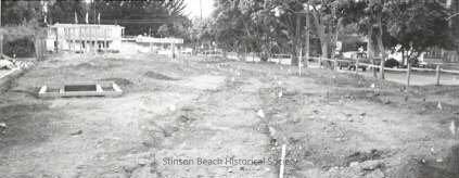 Wide angle shot of a barren dirt lot soon to become Village Green I. The right side along Calle del Mar is tree-lined and fenced off with wooden beams. There is a wooden squared off spot center left. On the far side the Parkside Cafe/Snack Bar is visible.Collection