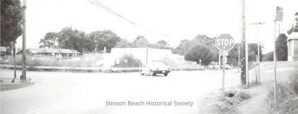 This black and white photo is similar to that of #1994-433-01 except the photographer has moved closer to the intersection so the trees on the right hand are not visible but the arterial stop sign on the right is clearly shown. There is a car turning left off Highway 1onto Calle del Mar and a closer view of the white building as well as the post office building to the left of it. (See notes 1994-425-01).Collection