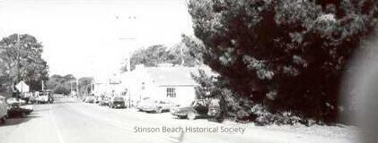 Wide angle, slightly overexposed shot of Highway One passing through Stinson Beach going north. On the right, beyond a large clump of trees, there are several diagonally parked cars. Further on the cars are parked parallel to the road in front of the buildings (first The Barn, and beyond it the Sand Dollar, Oceanic Realty, Shore Store - however photo is too washed out to differentiate the buildings). On the left side of the highway there are more parked cars.Collection