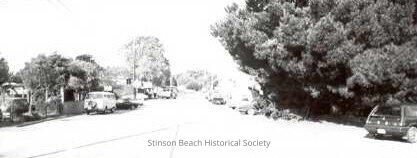 Wide angle shot of Highway 1 through Stinson Beach looking north. Angle is slightly different than previous in that more of the opposite (west) side of the highway is visible. The first car parked along the left side of the road is a VW bus in front of a walkway separated from the businesses there by a wooden fence and some low trees. None of the businesses are actually visible and the photo is very washed out.Collection